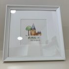 Der Rahmen ist jeweils 23 x 23 cm (außen) und 13 x 13 (innen). Er kann aufgestellt oder aufgehangen werden. Aktuell gibt es sie in schwarz und weiß.