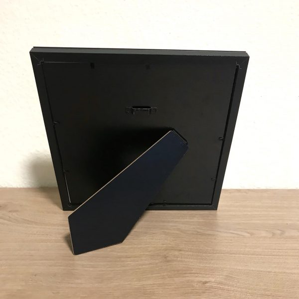 Der Rahmen ist jeweils 23 x 23 cm (außen) und 13 x 13 (innen). Er kann aufgestellt oder aufgehangen werden. Aktuell gibt es sie in schwarz und weiß.