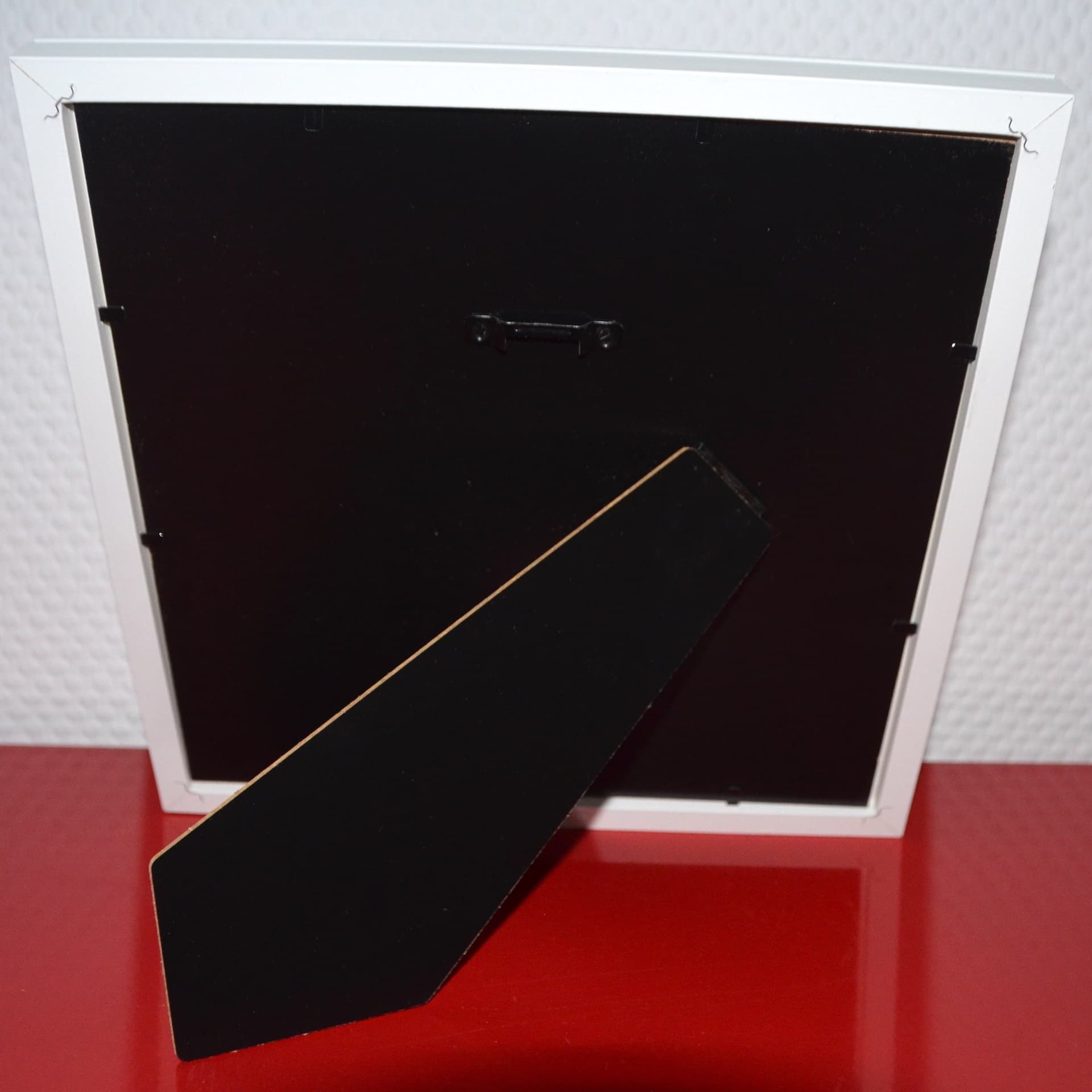 Der Rahmen ist jeweils 23 x 23 cm (außen) und 13 x 13 (innen). Er kann aufgestellt oder aufgehangen werden. Aktuell gibt es sie in schwarz und weiß.