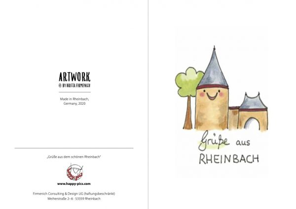 Grußkarte (Druck): glückliche Burg „Grüße aus dem schönen Rheinbach“